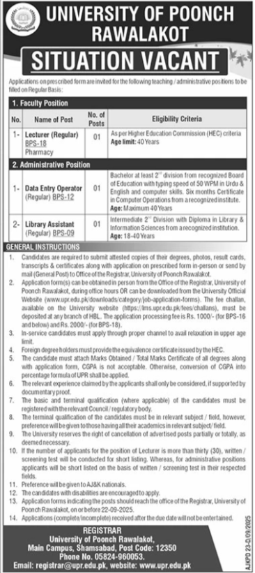 - Application forms indicating the posts should reach the office of the Registrar, University of Poonch Rawalakot, on or before 22-09-2025.