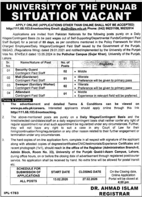 University Of Punjab UOP Lahore Jobs 2026 announce the Contract career opportunities for the post of See Below Ad in Punjab, Lahore for the fresh and experienced candidates on Contract basis who have Check Advertisement degree. Posted date of this post is 19/02/2026 and the last date is 27/02/2026. if you are eligible for this job apply before due date.
