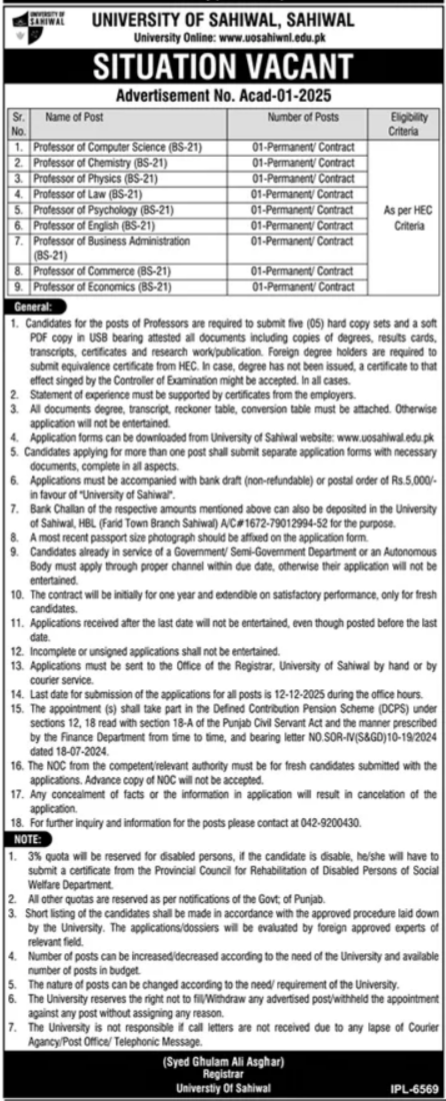 University Of Sahiwal Jobs 2025 announce the Contract career opportunities for the post of See Below Ad in Punjab, Sahiwal for the fresh and experienced candidates on Contract basis who have Check Advertisement degree. Posted date of this post is 21/11/2025 and the last date is 12/12/2025. if you are eligible for this job apply before due date.