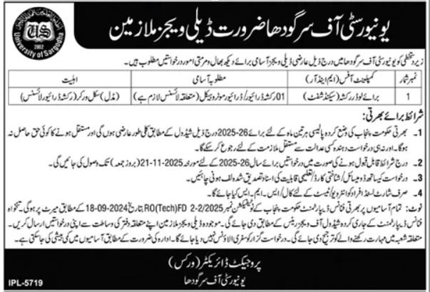 Applications are invited from the undersigned for the following temporary daily wage posts at the University of Sargodha for maintenance and repair work.
