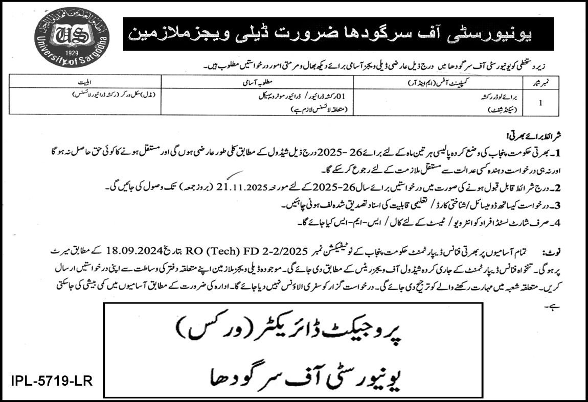 University Of Sargodha UOS Job 2025 announce the Contract career opportunities for the post of See Below Ad in Punjab, Sargodha for the fresh and experienced candidates on Contract basis who have Check Advertisement degree. Posted date of this post is 04/11/2025 and the last date is 21/11/2025. if you are eligible for this job apply before due date.