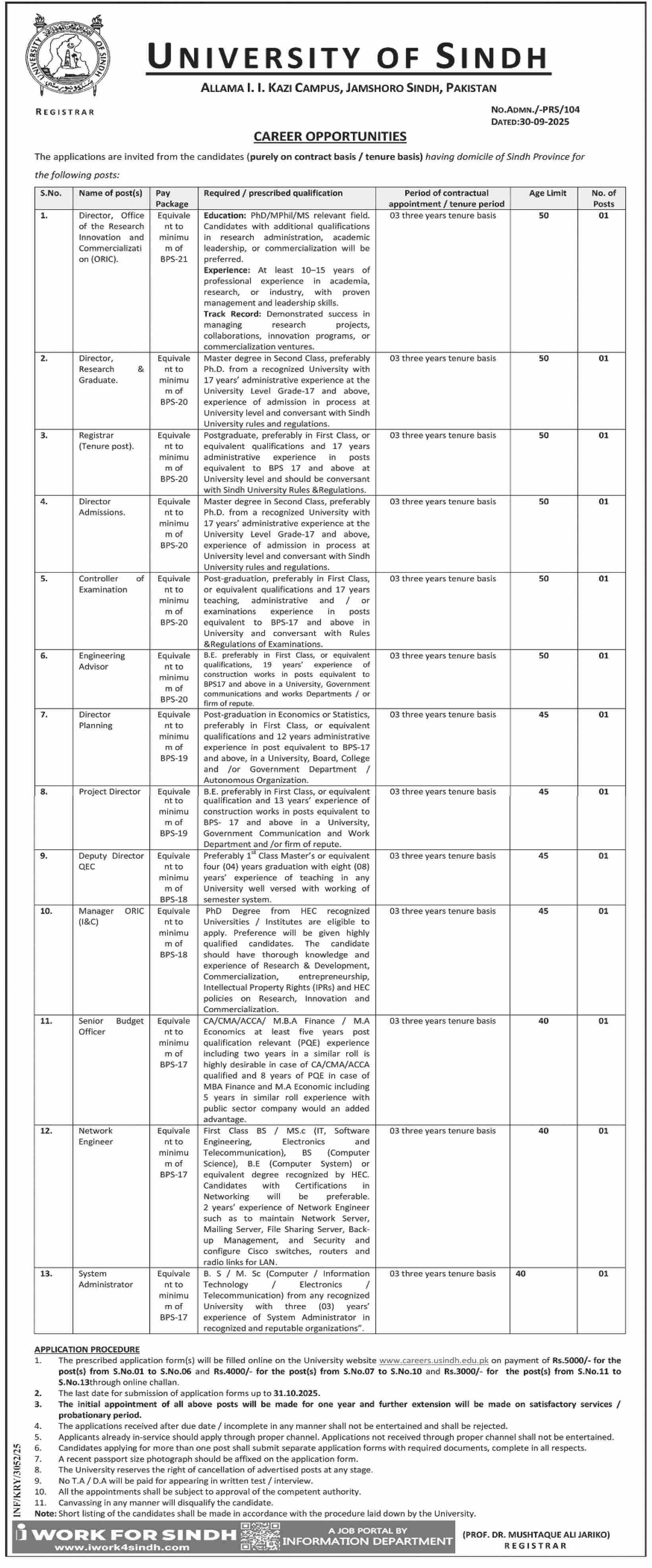 University Of Sindh Jamshoro Jobs 2025 For Director announce the Contract career opportunities for the post of See Below Ad in Sindh, Jamshoro for the fresh and experienced candidates on Contract basis who have Check Advertisement degree. Posted date of this post is 01/10/2025 and the last date is 31/10/2025. if you are eligible for this job apply before due date.