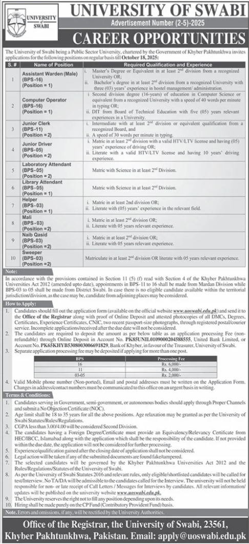 The University of Swabi being a Public Sector University, chartered by the Government of Khyber Pakhtunkhwa invites applications for the following positions on regular basis till October 18, 2025.