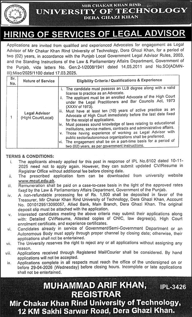 Applications are invited from qualified and experienced Advocates for engagement as Legal Advisor of Mir Chakar Khan Rind University of Technology, Dera Ghazi Khan, for a period of two (02) years, in accordance with the Punjab Local Government Legal Advisor Rules, 2003, and the Standing Instructions of the Law & Parliamentary Affairs Department, Government of the Punjab, vide letters No. Gen:2-1/2008/1941 dated 14.05.2011 and No.SO(ADMN-III):Misc/2025/1100 dated 17.03.2025.