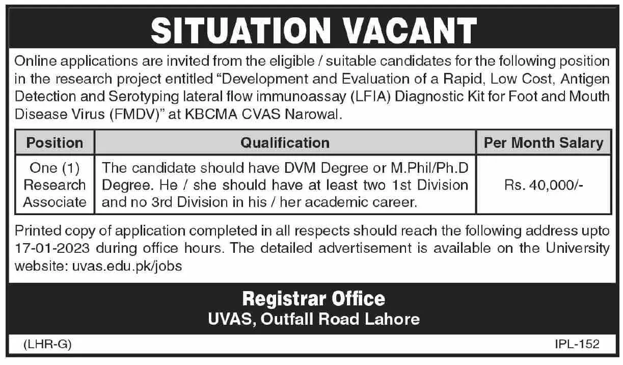 - the detailed adversitment is Avilable on the University websites ..UVAS .edu pk/jobs