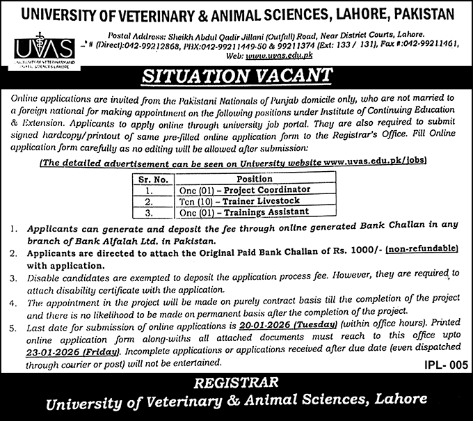 University of Veterinary & Animal Sciences Lahore Jobs announce the Contract career opportunities for the post of See Below Ad in Punjab, Lahore for the fresh and experienced candidates on Contract basis who have Check Advertisement degree. Posted date of this post is 04/01/2026 and the last date is 20/01/2026. if you are eligible for this job apply before due date.