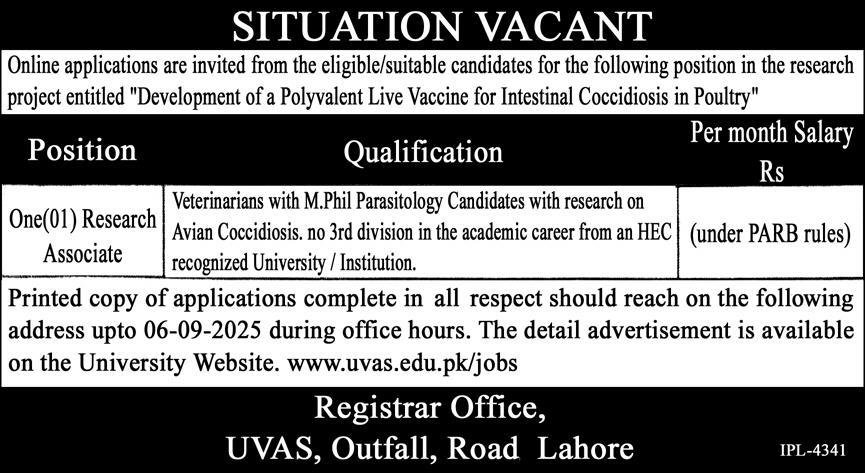 University Of Veterinary & Animal Sciences UVAS Jobs 2025 announce the Contract career opportunities for the post of See Below Ad in Punjab, Lahore for the fresh and experienced candidates on Contract basis who have Check Advertisement degree. Posted date of this post is 28/08/2025 and the last date is 06/09/2025. if you are eligible for this job apply before due date.
