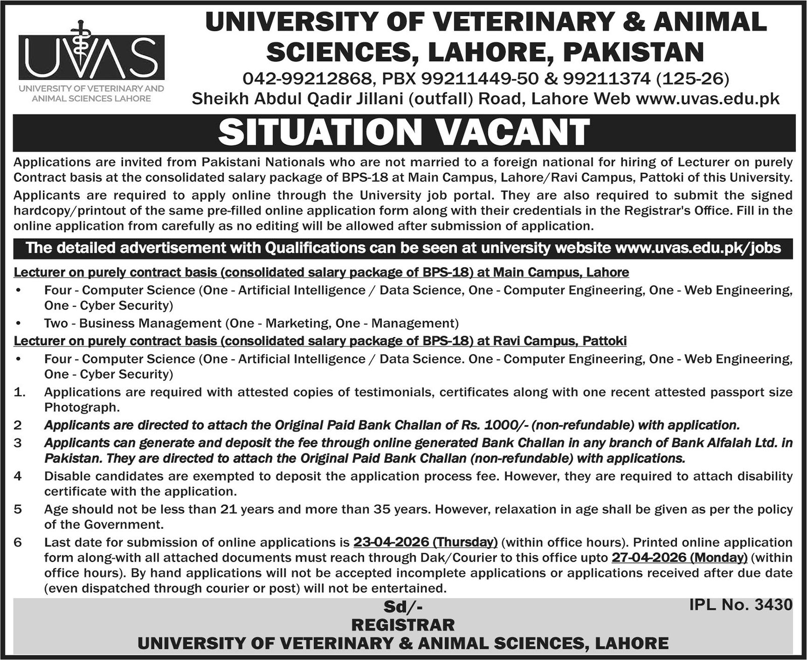 University Of Veterinary & Animal Sciences UVAS Jobs 2026 announce the Contract career opportunities for the post of See Below Ad in Punjab, Lahore for the fresh and experienced candidates on Contract basis who have Check Advertisement degree. Posted date of this post is 09/04/2026 and the last date is 23/04/2026. if you are eligible for this job apply before due date.