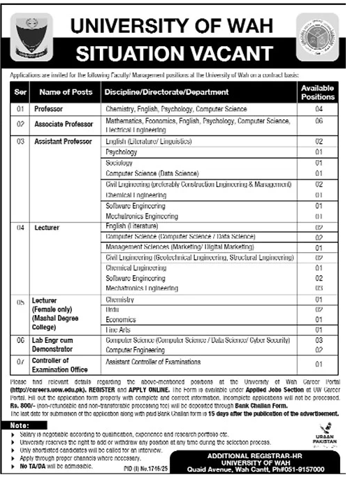 Please find relevant details regarding the above-mentioned positions at the University of Wah Career Portal . REGISTER and APPLY ONLINE. The form is available under Applied Jobs Section at UW Career Portal. Fill out the application form properly with complete and correct information. Incomplete applications will not be processed. Rs. 800/- (non-refundable and non-transferable) processing fee will be deposited through Bank Challan Form. The last date for submission of the application along with paid Bank Challan form is 15 days after the publication of the advertisement.