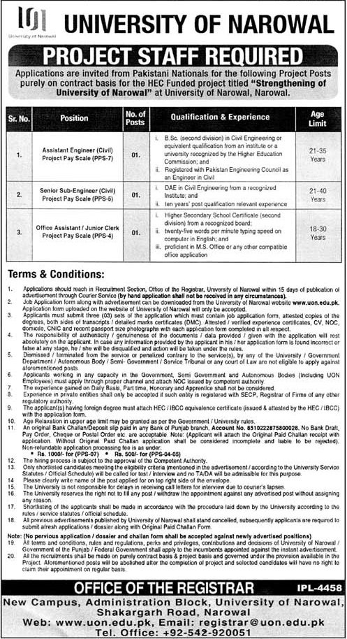 Applications are invited from Pakistani Nationals for the following Project Posts purely on contract basis for the HEC Funded project titled "Strengthening of University of Narowal" at University of Narowal, Narowal.