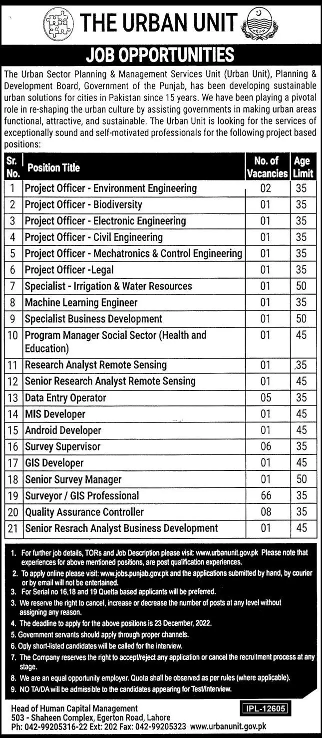 Urban Unit Punjab Lahore Jobs 2022 announce the Contract career opportunities for the post of See Below Ad in Punjab, Lahore for the fresh and experienced candidates on Contract basis who have Check Advertisement degree. Posted date of this post is 06/12/2022 and the last date is 23/12/2022. if you are eligible for this job apply before due date.