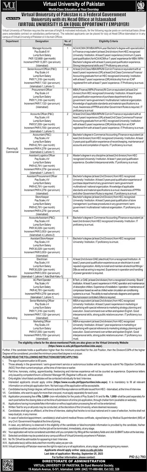 Virtual University of Pakistan VU Islamabad Jobs 2023 announce the Contract career opportunities for the post of See Below Ad in Federal, Islamabad for the fresh and experienced candidates on Contract basis who have Check Advertisement degree. Posted date of this post is 03/09/2023 and the last date is 25/09/2023. if you are eligible for this job apply before due date.