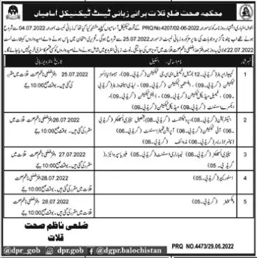 viva Test in Health Department Kalat 2022 announce the Contract career opportunities for the post of See Below Ad in Balochistan, Kalat for the fresh and experienced candidates on Contract basis who have Check Advertisement degree. Posted date of this post is 30/06/2022 and the last date is 28/07/2022. if you are eligible for this job apply before due date.
