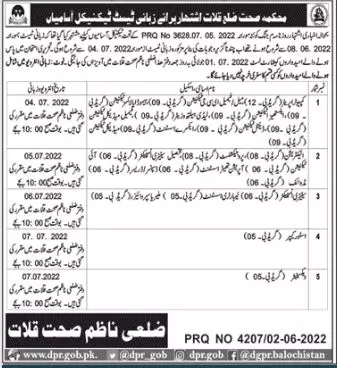 Viva Test in Health Department Kalat Balochistan announce the Permanent career opportunities for the post of See Below Ad in Balochistan, Kalat for the fresh and experienced candidates on Permanent basis who have Check Advertisement degree. Posted date of this post is 03/06/2022 and the last date is 07/07/2022. if you are eligible for this job apply before due date.