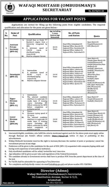 - People also search for these vacancies as Federal Ombudsman Secretariat Jobs/Wafaqi Mohtasib Secretariat Jobs. More than 70 vacancies have been announced, including quotas for each province of Pakistan, Federal Areas, and AJK.