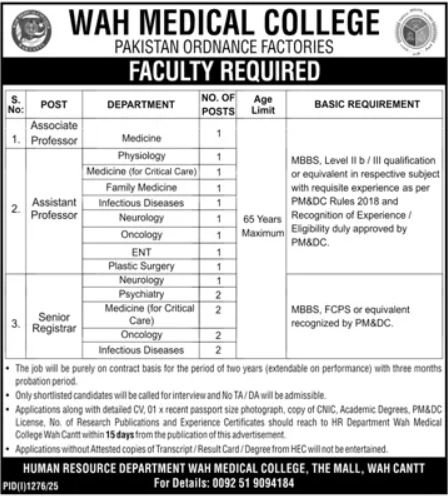Wah Medical College POF Jobs 2025 For Senior Registrar announce the Contract career opportunities for the post of See Below Ad in Punjab for the fresh and experienced candidates on Contract basis who have Check Advertisement degree. Posted date of this post is 13/08/2025 and the last date is 27/08/2025. if you are eligible for this job apply before due date.