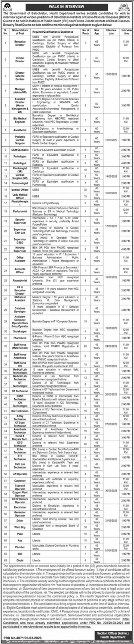 Walk In Interviews For Jobs At Health Department announce the Contract career opportunities for the post of See Below Ad in Balochistan, Quetta for the fresh and experienced candidates on Contract basis who have Check Advertisement degree. Posted date of this post is 07/03/2026 and the last date is 30/03/2026. if you are eligible for this job apply before due date.