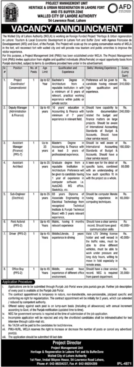 Walled City Of Lahore Authority Jobs 2025 announce the Contract career opportunities for the post of See Below Ad in Punjab, Lahore for the fresh and experienced candidates on Contract basis who have Check Advertisement degree. Posted date of this post is 02/10/2025 and the last date is 17/10/2025. if you are eligible for this job apply before due date.