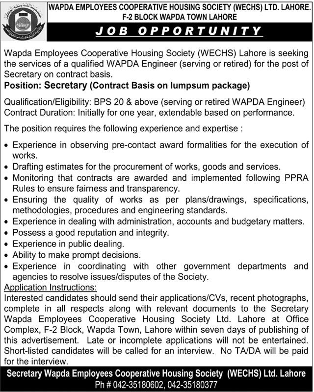 Wapda Employees Cooperative Housing Society (WECHS) Lahore is seeking the services of a qualified WAPDA Engineer (serving or retired) for the post of Secretary on contract basis.