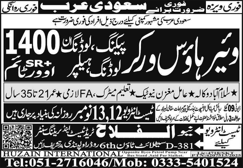 Warehouse Worker & Loading Worker Jobs 2025 announce the Contract career opportunities for the post of See Below Ad in Saudi Arabia for the fresh and experienced candidates on Contract basis who have Check Advertisement degree. Posted date of this post is 12/11/2025 and the last date is 13/11/2025. if you are eligible for this job apply before due date.