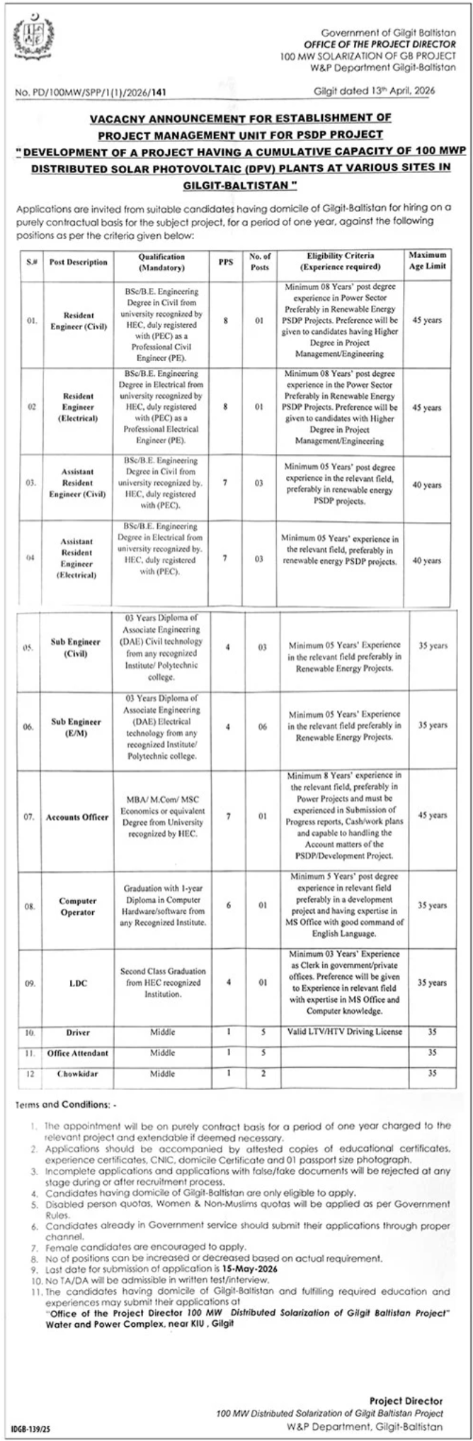 Water And Power Department Gilgit Jobs 2026 announce the Contract career opportunities for the post of See Below Ad in Gilgit Baltistan, Gilgit for the fresh and experienced candidates on Contract basis who have Check Advertisement degree. Posted date of this post is 16/04/2026 and the last date is 15/05/2026. if you are eligible for this job apply before due date.