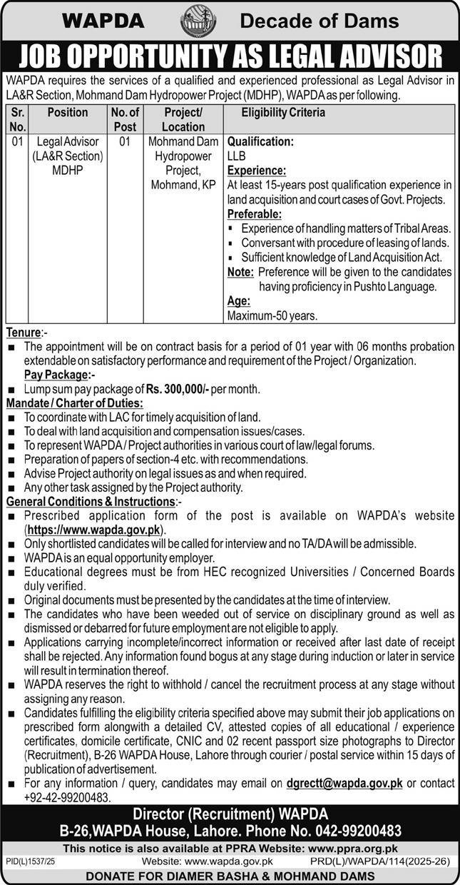 Water And Power Development Authority Jobs 2025 announce the Contract career opportunities for the post of See Below Ad in Punjab, Lahore for the fresh and experienced candidates on Contract basis who have Check Advertisement degree. Posted date of this post is 07/12/2025 and the last date is 22/12/2025. if you are eligible for this job apply before due date.
