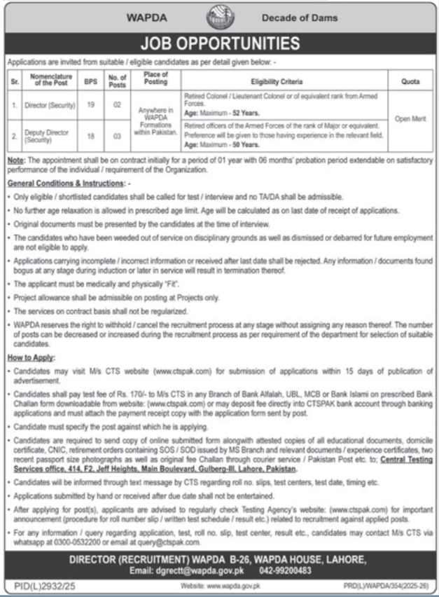 1. Director (Security) 19 02 Anywhere in WAPDA Formations within Pakistan Retired Colonel / Lieutenant Colonel or equivalent from Armed Forces. Age Max: 52 Years.