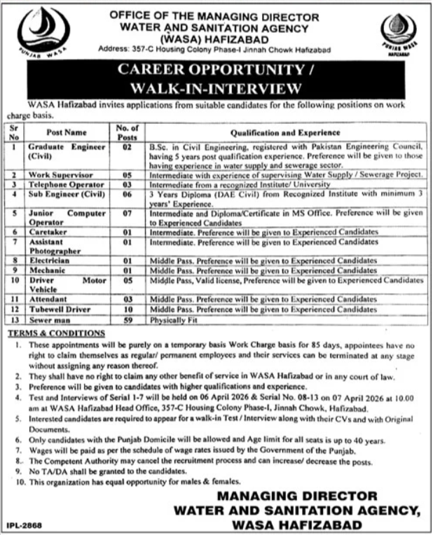 Water and Sanitation Agency WASA Hafizabad Jobs 2026 announce the Contract career opportunities for the post of See Below Ad in Punjab, Hafizabad for the fresh and experienced candidates on Contract basis who have Check Advertisement degree. Posted date of this post is 20/03/2026 and the last date is 04/04/2026. if you are eligible for this job apply before due date.