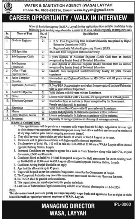 Water And Sanitation Agency WASA Layyah Jobs 2026 announce the Contract career opportunities for the post of See Below Ad in Punjab, Layyah for the fresh and experienced candidates on Contract basis who have Check Advertisement degree. Posted date of this post is 30/03/2026 and the last date is 13/04/2026. if you are eligible for this job apply before due date.