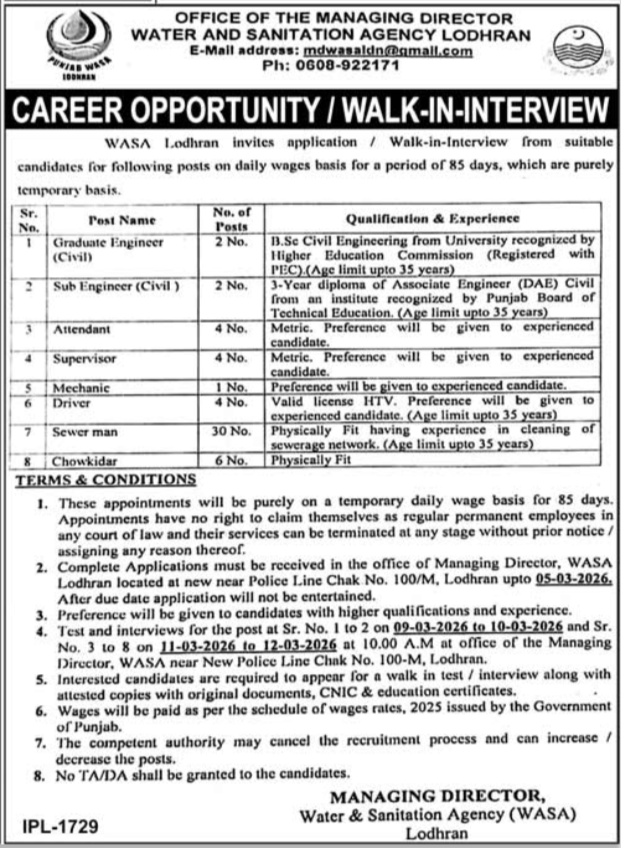 Water And Sanitation Agency WASA Lodhran Jobs Notice 2026 announce the Contract career opportunities for the post of See Below Ad in Punjab, Lodhran for the fresh and experienced candidates on Contract basis who have Check Advertisement degree. Posted date of this post is 19/02/2026 and the last date is 05/03/2026. if you are eligible for this job apply before due date.