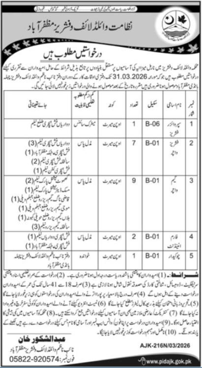 Applications are invited for the appointment of candidates with the following conditions on a permanent basis for the non-gazetted vacancies in the Department of Home, Wildlife & Fisheries. Applications must be received at the office of the Deputy Director Wildlife & Fisheries, Chela Bandi, Muzaffarabad by 31.03.2026 during office hours. Applications received after the due date will not be considered.