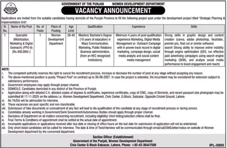Women Development Department Lahore Job 2025 announce the Contract career opportunities for the post of See Below Ad in Punjab, Lahore for the fresh and experienced candidates on Contract basis who have Check Advertisement degree. Posted date of this post is 05/11/2025 and the last date is 17/11/2025. if you are eligible for this job apply before due date.