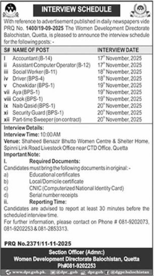 Women Development Directorate Balochistan Jobs Interview2025 announce the Contract career opportunities for the post of See Below Ad in Balochistan, Quetta for the fresh and experienced candidates on Contract basis who have Check Advertisement degree. Posted date of this post is 12/11/2025 and the last date is 20/11/2025. if you are eligible for this job apply before due date.