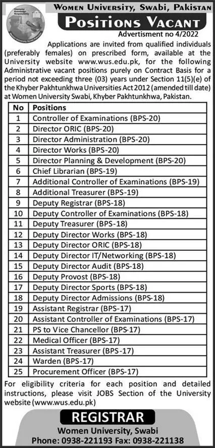 Women University Swabi Jobs announce the Contract career opportunities for the post of See Below Ad in Khyber Pakhtunkhwa for the fresh and experienced candidates on Contract basis who have Check Advertisement degree. Posted date of this post is 20/02/2022 and the last date is 30/03/2022. if you are eligible for this job apply before due date.