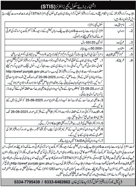 - Interested female residents of Dera Ghazi Khan district should contact Workers Welfare School Girls, Gulshan Saeed Colony, Old Sui Gas Office, Gaddai Road, Dera Ghazi Khan. Information and application forms for the School Teaching Intern Program can be downloaded from the Punjab Workers Welfare Fund website or obtained from the school office and submitted along with attested documents by 20-09-2025. All candidates are advised to bring original educational certificates and other documents at the time of interview.