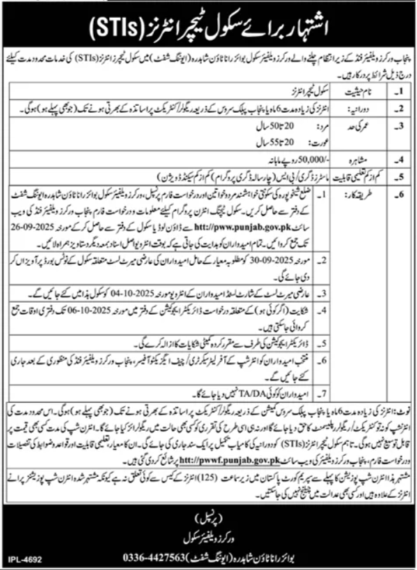 Note: The maximum duration for interns will be 6 months or until the recruitment of regular contract teachers through the Punjab Public Service Commission, whichever comes first. This limited-duration internship will not grant the right to a regular contract or regularization of appointment under any circumstances. The internship period will not be extended under any circumstances. However, School Teacher Interns (STIs) will be issued a certificate upon successful completion of the internship. Details regarding their educational qualifications, rules, and regulations, and the application form have been published on the Punjab Workers Welfare Fund website:.