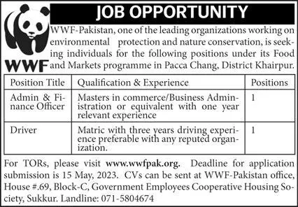 submission is 15 May, 2023. CVs can be sent at WWF-Pakistan office, House #.69, Block-C, Government Employees Cooperative Housing Society, Sukkur. Landline: 071-5804674