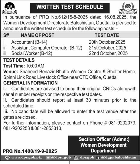 In pursuance of PRQ No.612/15-8-2025 dated 16.08.2025, the Women Development Directorate Balochistan, Quetta, is pleased to announce the written test schedule for the following posts: -