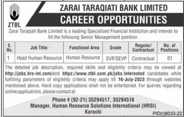 - The detailed job description, required skills and eligibility criteria may be viewed at http://jobs.hrs-int.com/and https://www.ztbl.com.pk/jobs.