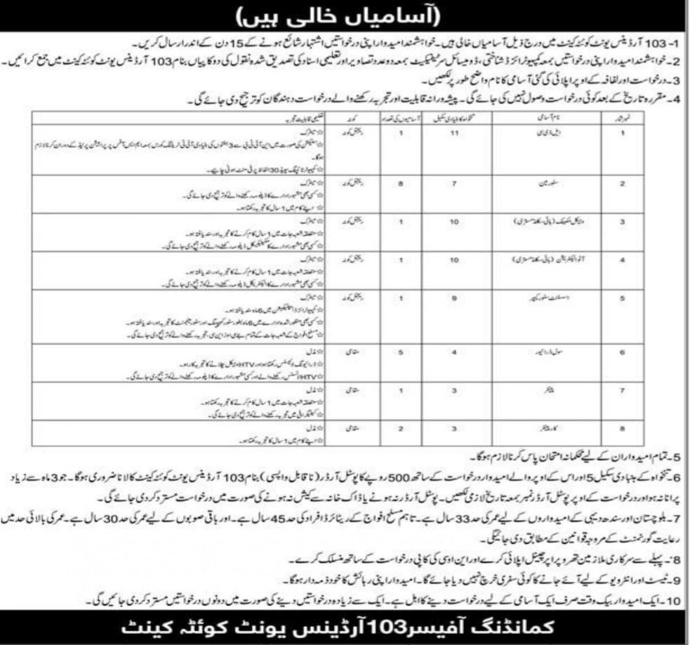 103 Ordance Unit Quetta Cantt Jobs 2026 announce the Contract career opportunities for the post of See Below Ad in Balochistan, Quetta for the fresh and experienced candidates on Contract basis who have Check Advertisement degree. Posted date of this post is 26/04/2026 and the last date is 11/05/2026. if you are eligible for this job apply before due date.