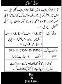 Vacant posts including civilian cook are announced in 17 DSF Company Karachi, karachi Sindh Pakistan as per 20 August 2023 advertisement in daily Jang Newspaper.