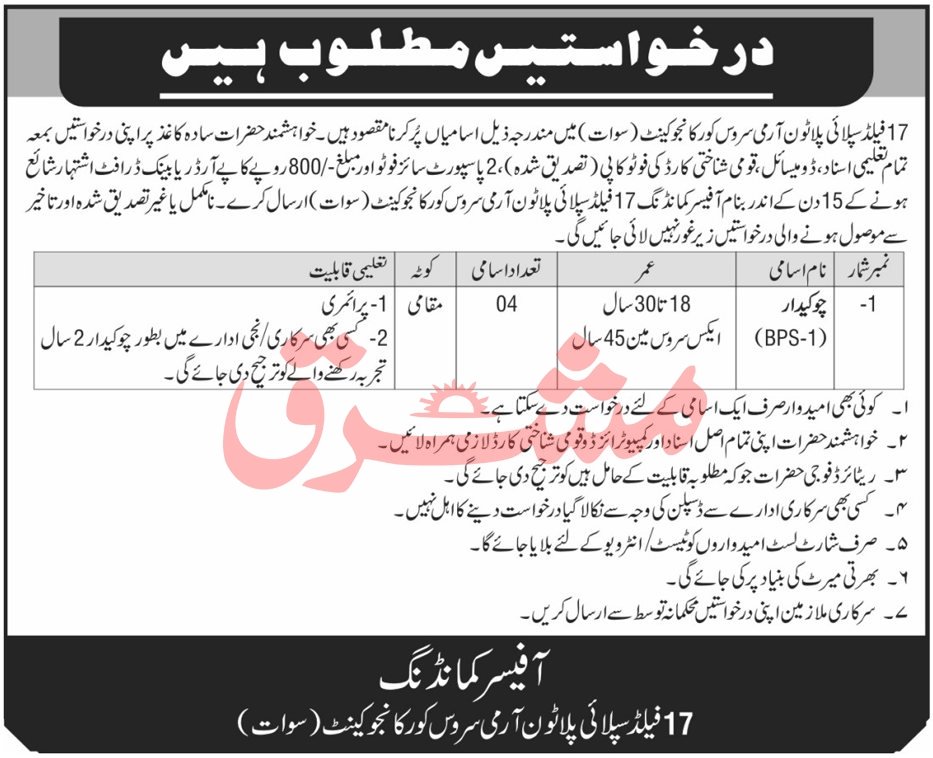 Applications are invited to fill the following vacancies at 17 Field Supply Platoon Army Service Corps, Kanjoo Cantt (Swat). Interested individuals should submit their applications on plain paper along with all educational certificates, domicile, photocopy of National Identity Card (attested), 2 passport size photos, and a pay order or bank draft of PKR 800/- payable to the Commanding Officer 17 Field Supply Platoon Army Service Corps Kanjoo Cantt (Swat) within 15 days of the advertisement publication. Incomplete, unverified, or late applications will not be considered.