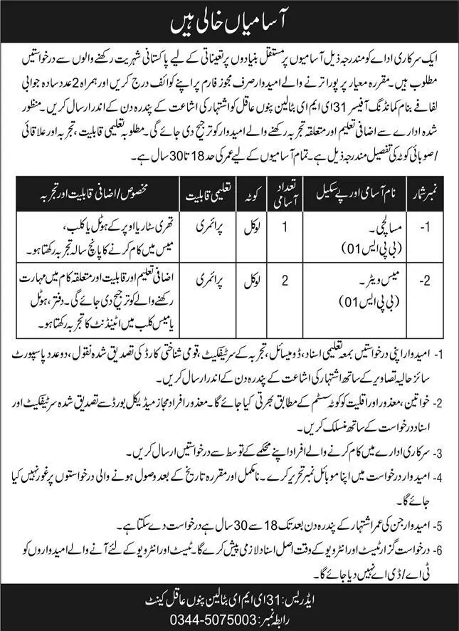 - Government Organization Pano Aqil, pano aqil Sindh Pakistan invites applications from eligible candidates for the post of mess waiter and masalchi as per advertisement of May 10, 2023 published in daily Express Newspaper. Candidates with Primary etc. educational background will be preferred.