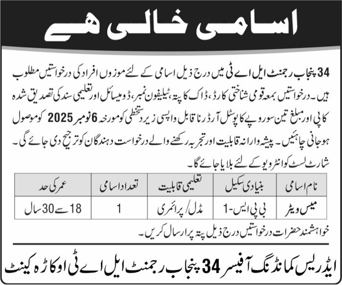 34 Punjab Regiment Okara Punjab Jobs 2025 announce the Contract career opportunities for the post of See Below Ad in Punjab, Okara for the fresh and experienced candidates on Contract basis who have Check Advertisement degree. Posted date of this post is 03/11/2025 and the last date is 06/11/2025. if you are eligible for this job apply before due date.