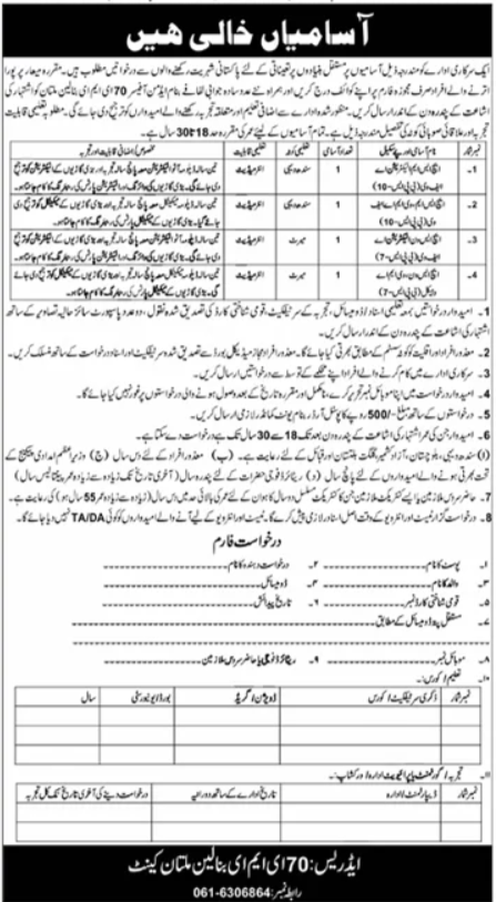 A government institution requires applications from Pakistani citizens for permanent appointments to the following posts. Individuals who meet the specified standards should fill out the prescribed form and send it with a new, simple envelope to the Admin Officer, 70 EME Battalion, within 20 days of the advertisement's publication. Candidates with additional education and relevant experience from approved institutions will be given preference. The educational qualification, experience, and regional/provincial quota details are as follows. The age limit for all posts is 18 to 30 years.