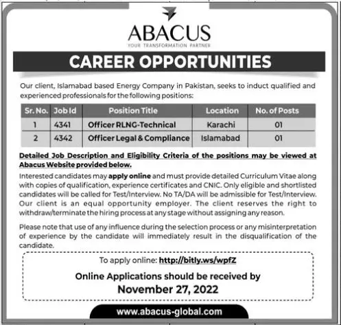 - Abacus Consulting Pvt Limited invites applications for job positions advertised in daily The News dated 9 November 2022 for following vacancies in Islamabad, islamabad Islamabad Pakistan.