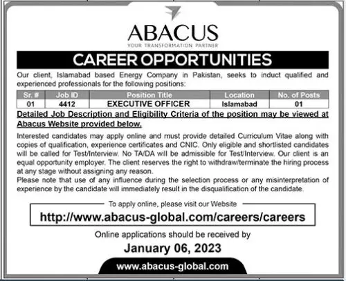 Abacus Consulting Pvt Limited Islamabad Job 20223 announce the Contract career opportunities for the post of See Below Ad in Federal, Islamabad for the fresh and experienced candidates on Contract basis who have Check Advertisement degree. Posted date of this post is 21/12/2022 and the last date is 06/01/2023. if you are eligible for this job apply before due date.