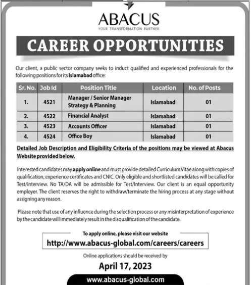 - Abacus Global Islamabad, islamabad Islamabad Pakistan invites applications from eligible candidates for the post of financial analyst, office boy, manager, manager strategy, manager planning and accounts officer as per advertisement of April 1, 2023 published in daily Jang Newspaper. Persons with Master, Intermediate and Bachelor etc. education can apply.