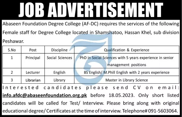 Abaseen Foundation Degree College Peshawar Jobs 2023 announce the Contract career opportunities for the post of See Below Ad in Khyber Pakhtunkhwa, Peshawar for the fresh and experienced candidates on Contract basis who have Check Advertisement degree. Posted date of this post is 10/05/2023 and the last date is 18/05/2023. if you are eligible for this job apply before due date.
