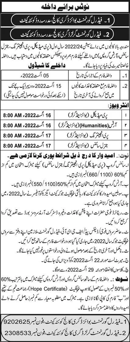 Admission in Federal Government Boys Degree College Quetta announce the Contract career opportunities for the post of See Below Ad in Balochistan, Quetta for the fresh and experienced candidates on Contract basis who have Check Advertisement degree. Posted date of this post is 05/08/2022 and the last date is 15/08/2022. if you are eligible for this job apply before due date.